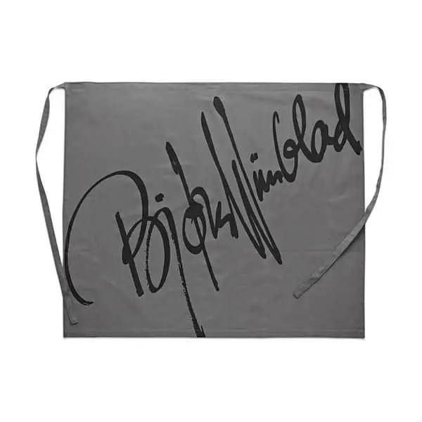 Gør det til en kunst at beskytte tøjet mod stænk og sprøjt fra madlavningen med et elegant kokkeforklæde. Forklædet i 100 % bomuld bærer Bjørn Wiinblads signatur på en enkel grå baggrund.