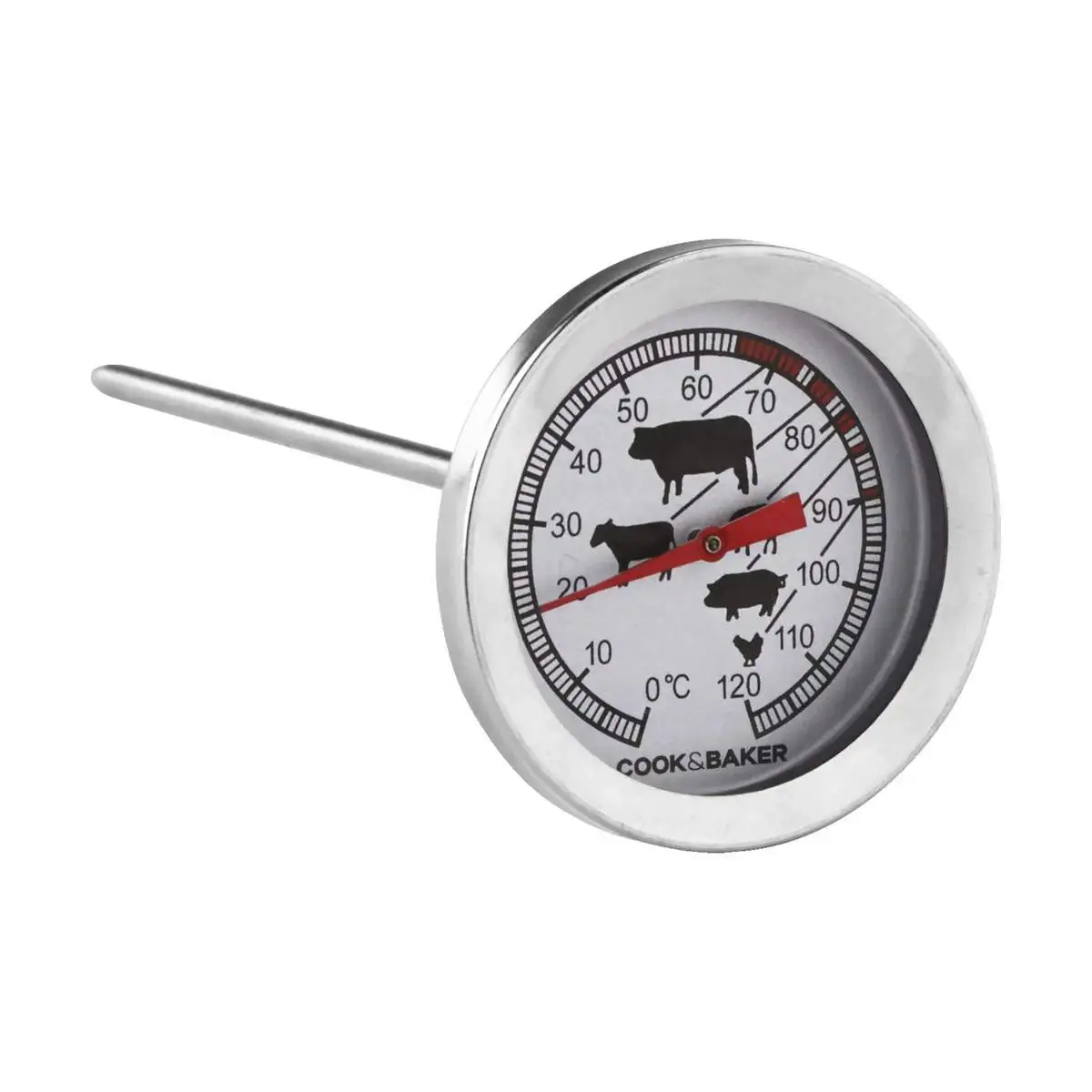 Cook & Baker stegetermometeret er for dig, der holder det enkelt i køkkenet – men sætter pris på godt udstyr. Uden alt muligt digitalt hurlumhej kan du nemt og enkelt aflæse temperaturen på din steg med termometret. Cook & Baker stegetermometret måler op til 120° C og har symboler for de forskellige kødarter. Nemmere bliver det ikke!