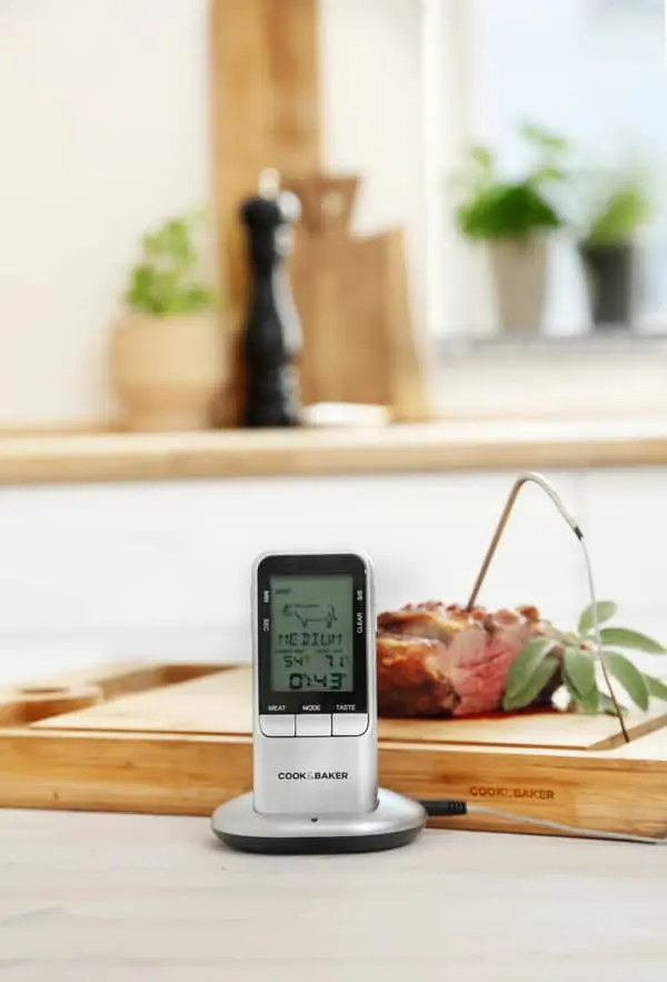 Sæsonens stege skal både serveres og tilberedes med stil, og til at hjælpe dig er Cook & Bakers enkle og funktionelle stegetermometer. Termometeret er trådløst og giver dig en målefunktion for 7 forskellige kødtyper, så du kan få saft og kraft ud af både lam og gris. Desuden medfølger en timer, display med lys og signal ved op til 30 meters afstand, så du kan holde øje med din steg fra alle hjemmets rum.