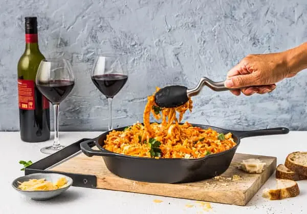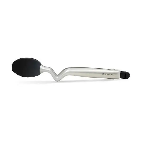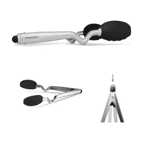 Clongs fra Dreamfarm er en smart klik-lås tang. Ligesom en tilbagetrækkelig “klik” pen åbner du din Clongs tang med ét tryk på en klik-knap, og hold den derefter lukket og tryk på klik-knappen igen for at holde den lukket. Clongs har en smart bøjning i håndtaget, så den ikke hviler på din bordplade – og bøjningen gør det også muligt at hvile tangen på kanten af din gryde.