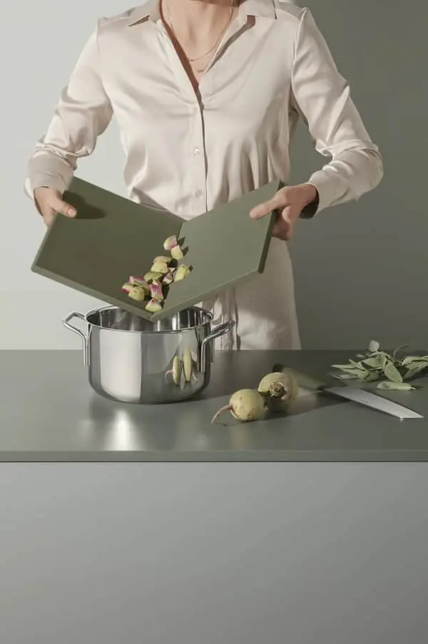 Når alle ingredienser skal op i gryden falder der en del ned ved siden af gryden, det slipper du også for, da de to skærebrætter kan sættes sammen og bukkes, så du får lavet en tragt ned til gryden. Mega smart!