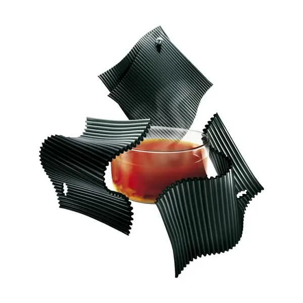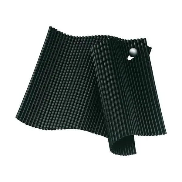 Sorte grydelapper i blød silikone, der tåler varme op til 300º C og opvaskemaskine. Med ophængskrog i aluminium. Design: Claus Jensen & Henrik Holbæk, Tools.