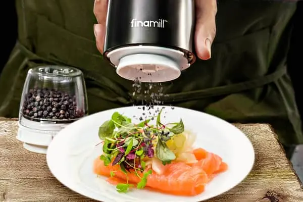 Krydderikværnen fra Finamill er batteridrevet og kan derfor betjenes med én hånd.