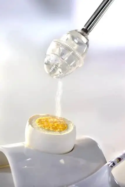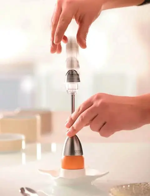 Et blødkogt æg skal nydes i fred og ro, uden at du skal bakse med at fjerne små stykker æggeskal fra æggeblommen. Med Gefu æggeskærer med indbygget saltstrøer har du et lille sæt til at bryde skallen på dit morgenæg helt perfekt. Sæt æggeskæreren over ægget, løft GEFU æggeskærers top, giv slip og fjern den knækkede æggeskal sammen med GEFU æggeskærer. Salt dit spiseklar æg lige tilpas med den indbyggede saltstrøer og sæt tænderne i det dejlige indhold. Højde: 16 cm.