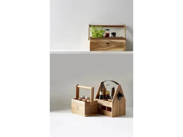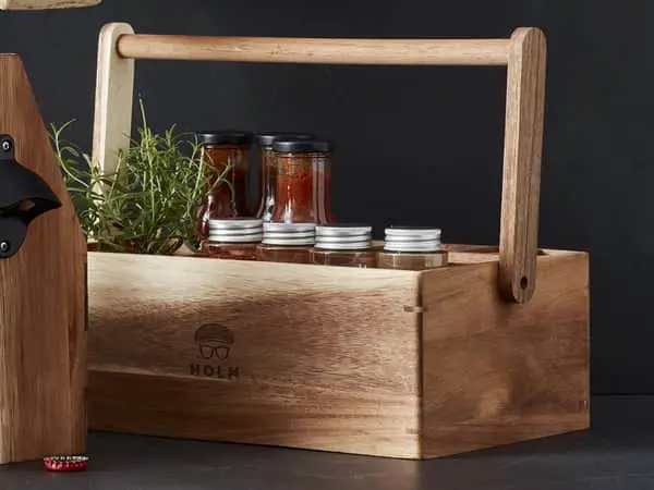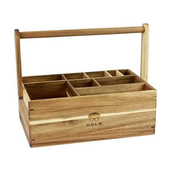 En smart værktøjskasse fra Holm, som er lavet i akacietræ og har 9 rum. Den kan anvendes til opbevaring af alt fra køkkenredskaber til salt- og peberkværne eller olie.