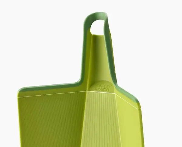 Chop2Pot skærebræt fra Joseph Joseph, hvor siderne kan foldes op, når du klemmer om håndtaget. På den måde kan du nemt hælde ingredienserne direkte ned i en skål eller gryde uden at spilde fx peberfrugtkerner ud over køkkengulvet. Skærebrættet har non-slip belægning og ligger sikkert på bordet. Brættet tåler opvaskemaskine.