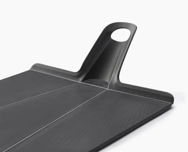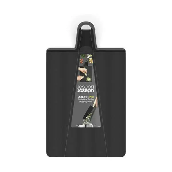 Chop2Pot skærebræt fra Joseph Joseph, hvor siderne kan foldes op, når du klemmer om håndtaget. På den måde kan du nemt hælde ingredienserne direkte ned i en skål eller gryde uden at spilde fx peberfrugtkerner ud over køkkengulvet. Skærebrættet har non-slip belægning og ligger sikkert på bordet. Brættet tåler opvaskemaskine.