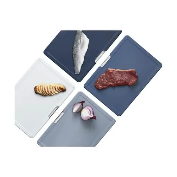 Hjælp den gode hygiejne og orden i køkkenet på vej med Folio skærebrætsættet fra Joseph Joseph. De 4 skærebrætter har hver deres farve, så du nemt kan skelne mellem, hvilket du bruger til at skære kød, grønt og brød på og holde madvarerne adskilt.