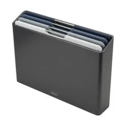 Hvert skærebræt har et smart håndtag, så du med et snuptag kan tage det op af kassen, der har en skrå åbning for nem adgang. Skridsikre fødder under kassen gør, at den står solidt på køkkenbordet. Nede i kassen står skærebrætterne adskilt, så luften kan cirkulere.