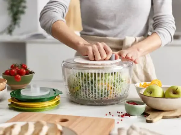 Salatslyngen leveres med forskellige skærehoveder, der kan indsættes i låget, og en praktisk håndbeskyttelse, der hjælper med at gøre madlavningen med skæreskiverne mere sikker. Den har desuden en skridsikker base, så den står fast under hele madlavningen, og så er du klar til at gå i gang med at lave lækre salater, der både kan laves og skylles i denne skål.
