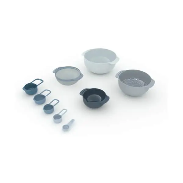 Alle røreskålene har store skridsikre bunde, og den mindste skål har smarte mål indeni og en tud der er nem at hælde af. Det er en samling med 9 enheder, som både indeholder store skåle, små skåle, en si, et dørslag og flere forskellige måleenheder.