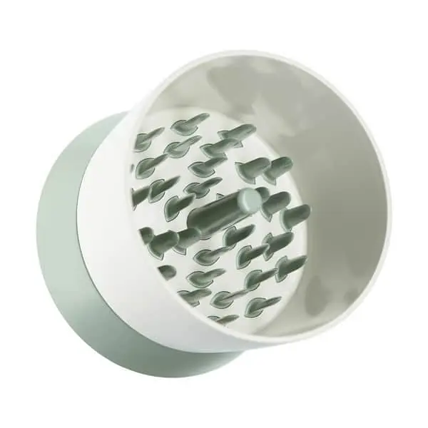 Det er ganske simpelt; Put grøntsagerne i den hvide beholder, sæt låget på og drej låg og beholder i hver sin retning. Du får lynhurtigt et flot resultat.