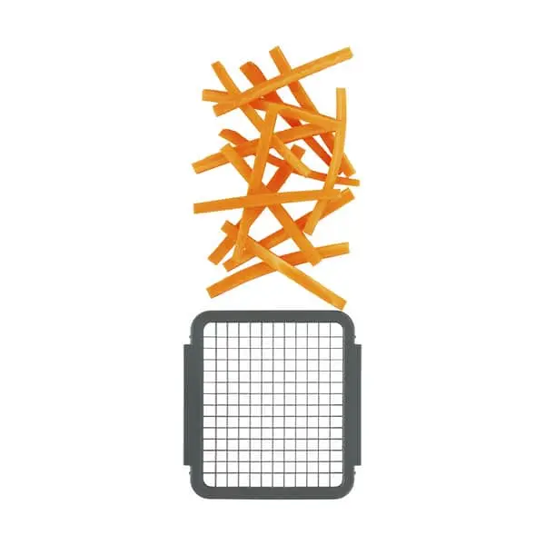 Med multiskæreren kan du hurtigt og nemt skære frugt og grøntsager i terninger eller staver. Sættet består af to skarpe knivindsatser til stave på 13 mm eller 6 mm kantlængde, samt en silikonemåtte for at beskytte køkkenbordet, når du bruger den.