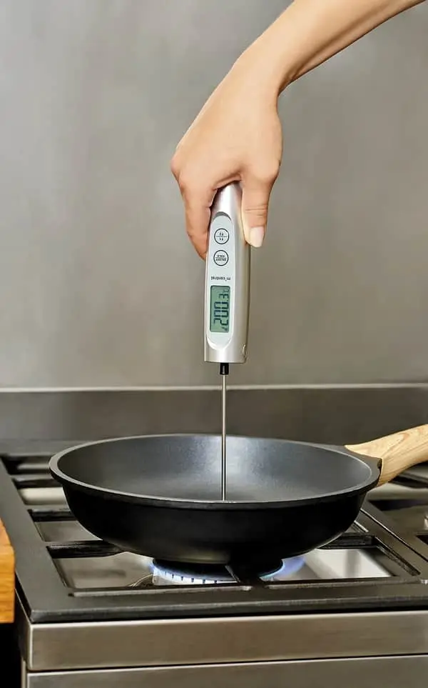 Kernetemperaturen i kød- og fiskeretter eller kager er vigtig under tilberedningen. Men det er også vigtigt at vide, hvor varm stegepanden, som du benytter, er. Og det kan du nu med dette termometer, der har dobbeltfunnktion – 2 målere!