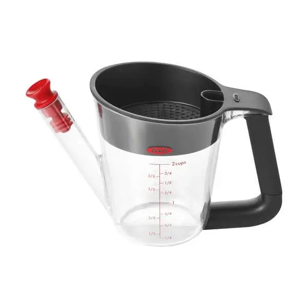 Fedtskilleren fra OXO kan hjælpe dig med at filtrere fonden, fordi den har en si i toppen, der fanger uønskede kød- eller grønsagsbidder. En smart stopper forhindrer fedtet i at komme op i hældetuden. Når fonden har stået lidt, og fedtet er skilt fra fonden, fjernes sien og stopperen, og fonden kan hældes ud af tuden og ned i gryden, uden at fedtet følger med.