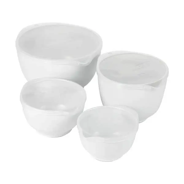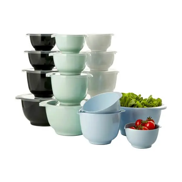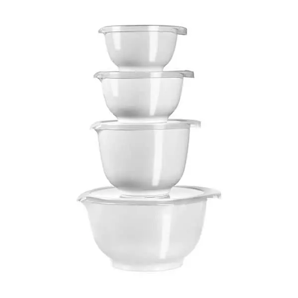 Her får du et sæt med fire røreskåle, hver med et plastlåg. Skålene er udstyret med en skridsikker gummiring i bunden, så de står fast, mens du rører i dem. Og så er de gode til både madlavning og opbevaring.