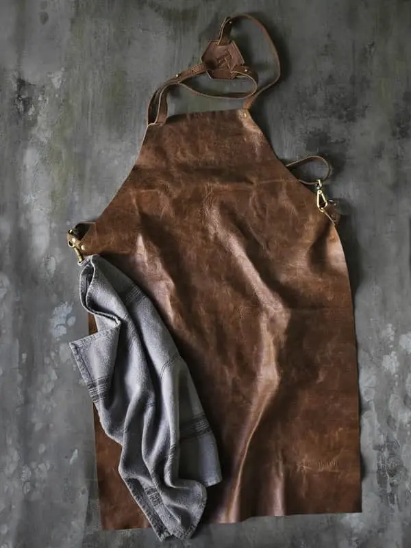 En sand køkkenmester lader sig ikke begrænse i et køkken. Beskyt tøjet mod fedtstænk og rødbedesaft med et læderforklæde fra Timm Vladimir Kitchen.